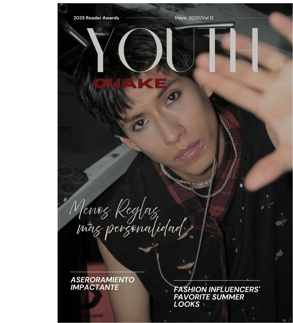 El nombre elegido para la editorial es “YOUTHQUAKE” que retrata a una juventud que rompe patrones, usa la moda como arma. Esta propuesta editorial expresa una visión radical y cruda de la identidad juvenil. A través de una estética influenciada por el punk, el grunge y el estilo visual kei, se construye un discurso donde la moda deja de ser solo ornamento para convertirse en una forma de resistencia, expresión y contradicción.